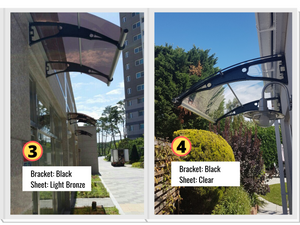 CANOFIX Polycarbonate Canopy provide Four Colour Options:1) Bracket: Grey, Sheet: Light Bronze2) Bracket: Grey, Sheet: Clear3) Bracket: Black, Shee...